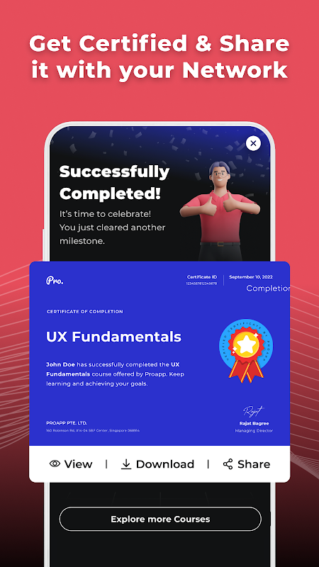 ในตอนท้ายของเส้นทางการเรียนรู้ของคุณ ใบรับรองความสำเร็จรอคุณอยู่! ใบรับรองนี้ถือเป็นข้อพิสูจน์ถึงความทุ่มเทและความรู้ของคุณในการออกแบบ UX ซึ่งช่วยเสริมพอร์ตโฟลิโอของคุณและปูทางสู่สาขาการออกแบบ UX