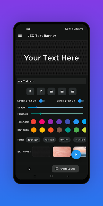 ด้วยการปรับแต่งที่หลากหลาย รวมถึงสี แบบอักษร ภาพเคลื่อนไหว และธีม คุณสามารถทำให้แบนเนอร์ของคุณมีเอกลักษณ์เฉพาะตัวเหมือนกับข้อความของคุณได้ แบ่งปันการออกแบบของคุณกับเพื่อน ๆ บันทึกลงในโทรศัพท์ของคุณ หรือแสดงในโหมดเต็มหน้าจอเพื่อให้ได้ผลสูงสุด