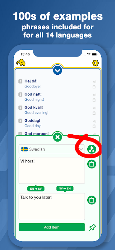 * คุณสามารถปัดตรวจสอบคำและวลีทั้งหมดของคุณได้โดยแตะปุ่ม 'ลง' สีน้ำเงิน จากนั้นให้ปัดไปทางซ้ายเพื่อเรียนรู้และจดจำคำศัพท์และวลีของคุณ