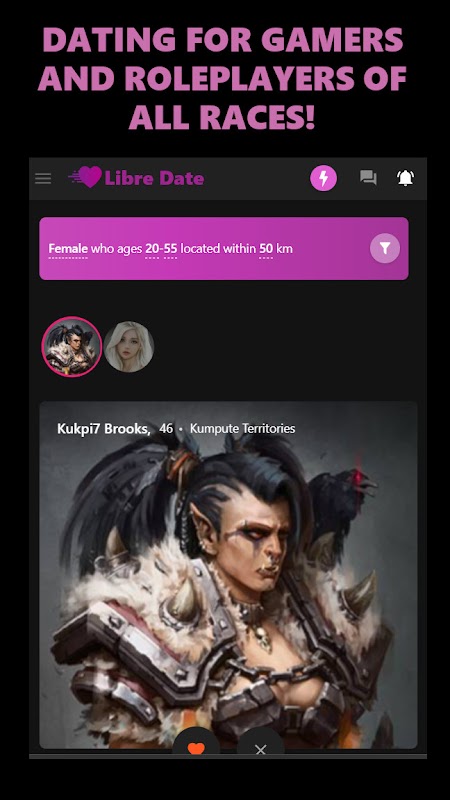 Libre Date is a dating app for roleplayers and gamers. Here being your self is optional. Date as your character, and connect with other roleplayers. This is the dating app where elves, orcs, trolls, and all manner of races may connect for fantasy dating, or even real dating.
