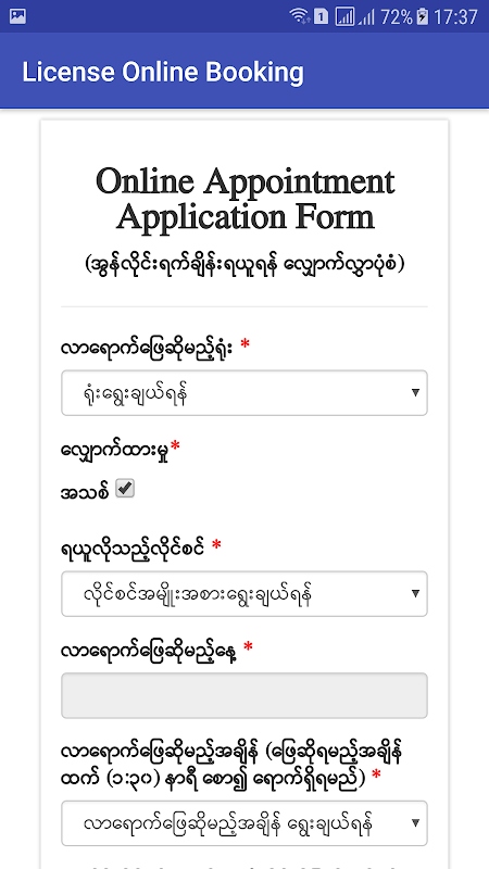 License Online Booking (ယာဥ္ေမာင္းလိုင္စင္ဘုိကင္) 5.0