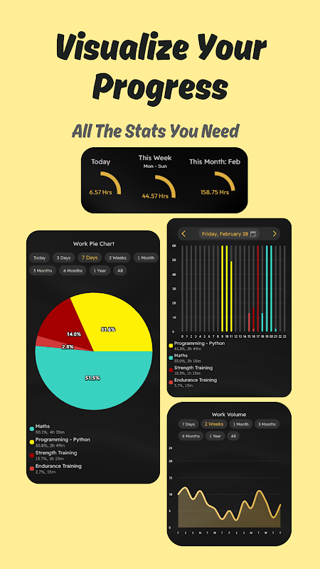 • รับคะแนนจากการติดตามเวลาทำงานของคุณและดูความก้าวหน้าของคุณพัฒนาไปตามวัน สัปดาห์ และเดือน