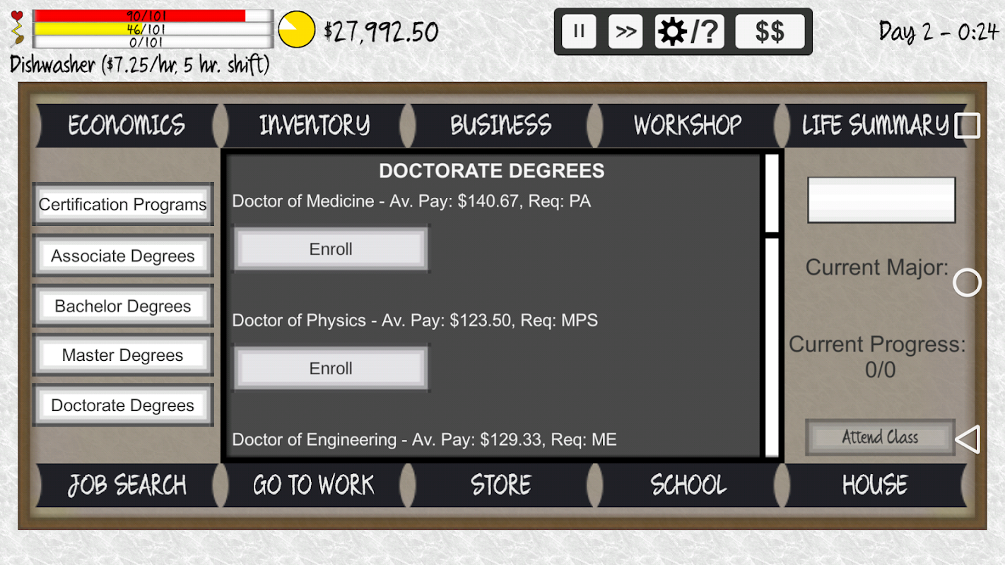 EVERYONE: Sorry, but due to technical mistakes during development (this was my first release) I am completely unable to continue updating the game, and so any bugs or errors or UI problems cannot be fixed. I did NOT do this on purpose (that doesn't even make sense), and I would absolutely fix it if I could. Sorry again. There might be a Life Simulator 3 in the future!
