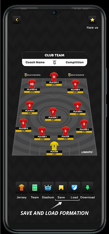 ทดลองรูปแบบการจัดรูปแบบต่างๆ เพื่อค้นหารูปแบบที่ดีที่สุดสำหรับทีมของคุณ แอพฟุตบอลผู้เล่นตัวจริงนี้มีตัวเลือกการจัดทีมที่หลากหลาย ทำให้เป็นผู้สร้างผู้เล่นตัวจริงฟุตบอลที่หลากหลายสำหรับแนวทางยุทธวิธี