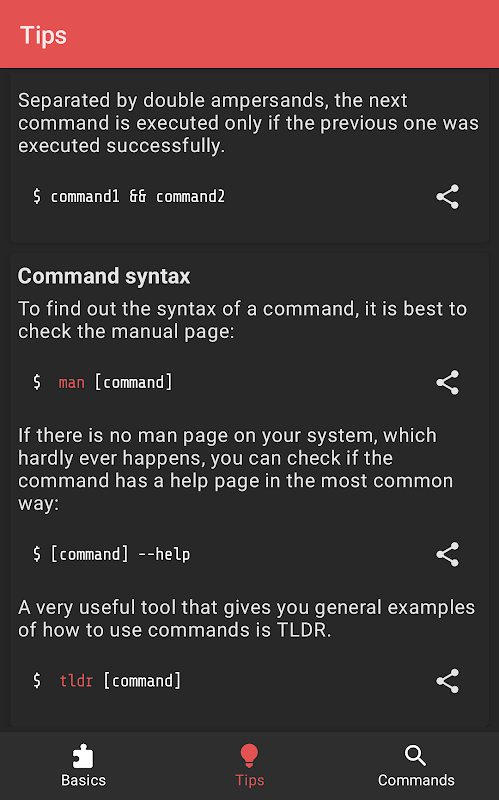 ปัจจุบันแอปนี้มีหน้าคู่มือ 7700 หน้า, 23 หมวดหมู่พื้นฐาน และเคล็ดลับทั่วไปเกี่ยวกับการใช้งานเทอร์มินัลมากมาย ใช้งานได้แบบออฟไลน์ 100% ไม่จำเป็นต้องเชื่อมต่ออินเทอร์เน็ต และไม่มีซอฟต์แวร์ติดตาม