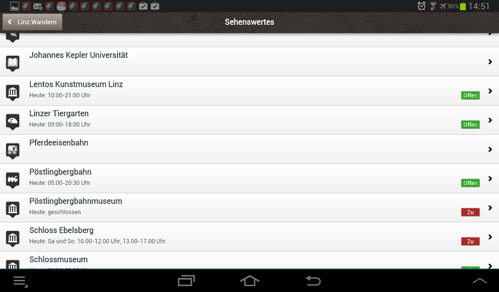 Linz.Wandern beschreibt 10 Stadtwanderwege in Linz. Die Wanderwege sind ausführlich beschrieben und können mit GPS live auf dem Stadtplan mitverfolgt werden. Neben der Wanderroute, dem Höhenprofil, der Länge der Wanderung und geschätzter Dauer sind auch alle Sehenswürdigkeiten und Tipps für eine Rast enthalten.