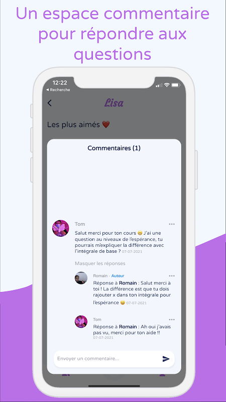 Construit sur un modèle de réseau social, Lisa te permet de chercher les cours dont tu as besoin. Utilise l'outil de recherche pour trouver un cours précis ou explore la plage d'accueil en fonction de ton niveau d'étude ou de tes matières préférées pour trouver ce qu'il te faut.