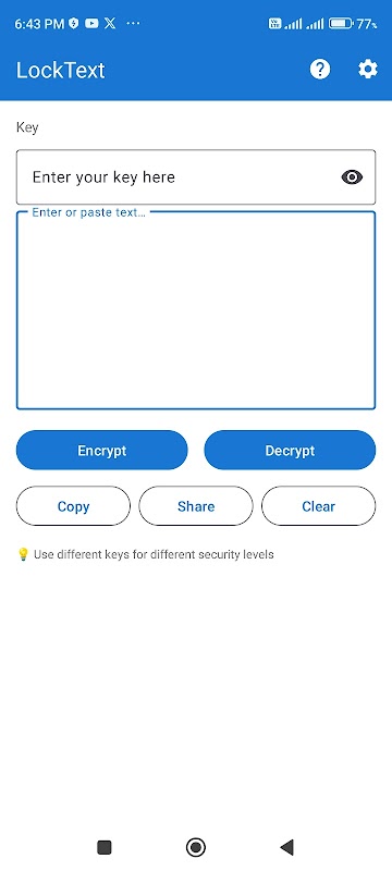 LockText คือแอปเข้ารหัสแบบออฟไลน์น้ำหนักเบาที่ช่วยปกป้องข้อมูลสำคัญของคุณด้วยการเข้ารหัส AES-256 ไม่ว่าจะเป็นรหัสผ่าน บันทึก หรือข้อความลับ คุณก็รักษาข้อมูลของคุณให้ปลอดภัยด้วยคีย์การเข้ารหัสแบบกำหนดเอง