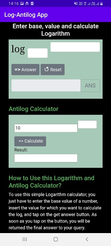 ในการแปลงแอนติล็อก คุณเพียงแค่ต้องป้อนฐานสำหรับแอนติล็อก โดยค่าเริ่มต้นฐานคือ 10 เมื่อเลือกฐานแล้ว คุณเพียงแค่ต้องป้อนค่าและแตะที่ปุ่มคำนวณแอนติล็อก