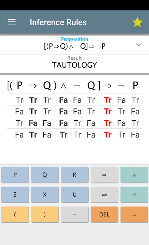 Logic Calculator Free is an app that gives the truth value of a logical proposition from 2 different ways: you can enter the individual truth value of the variables to deliver a single truth value true or false that corresponds the whole proposition, or you can enter the logical proposition and it automatically gives a truth table with all possible combinations depending the number of variables in use. In that case the result can be a tautology, a contingency or a contradiction.