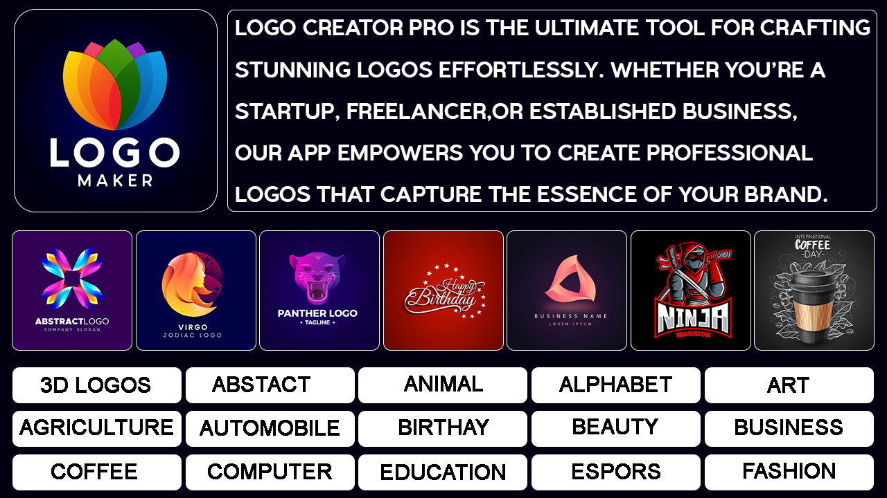 Logo Maker ช่วยให้คุณสร้างหรือออกแบบโลโก้สำหรับธุรกิจหรือแบรนด์ของคุณได้ เช่น คุณสามารถออกแบบโลโก้สำหรับช่อง YouTube ของคุณหรือสำหรับธุรกิจของคุณเอง เพียงแค่ออกแบบโลโก้และใช้โลโก้ที่น่าประทับใจของคุณได้อย่างง่ายดาย