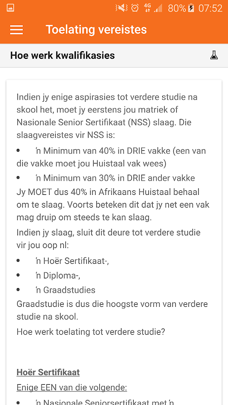 Die app beskryf die verskillende akademiese en tegniese vakke wat jy in Graad 9 kan neem en watter moontlike beroepe jy kan volg met jou kombinasie van vakke. Jy kan gaan kyk wat is die slaagvereistes na Graad 12 om met jou graad of diploma-studies voort te gaan.