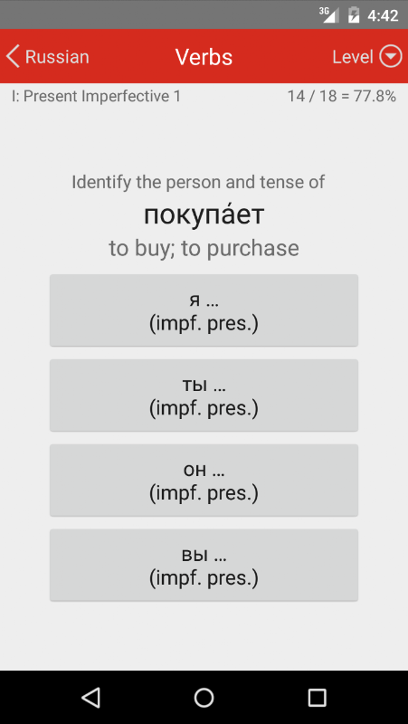 เมื่อใดก็ตามที่คุณมีโทรศัพท์มือถือและเป็นช่วงเวลาที่ว่างของคุณก็มีการทดสอบอย่างต่อเนื่องหลายทางเลือกในการเรียนรู้คำศัพท์ภาษารัสเซียวิภัตตินามและคำกริยาผัน คำตอบของคุณให้แต่ละคนได้รับการยืนยันทันทีหรือแก้ไขให้ถูกต้องและความรู้ของคุณจะเสริมด้วยการทำซ้ำ