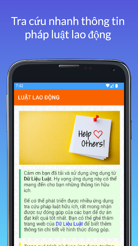 แอปพลิเคชัน "กฎหมายแรงงาน" เป็นแอปพลิเคชันมือถือที่มีประโยชน์และสะดวก ออกแบบมาเพื่อแนะนำและให้ข้อมูลเกี่ยวกับกฎหมายแรงงานของเวียดนาม