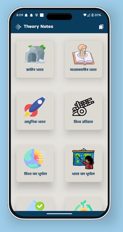 แอปนี้ครอบคลุมหัวข้อต่างๆ มากมาย เช่น วิทยาศาสตร์ทั่วไป เหตุการณ์ปัจจุบัน (เป็นภาษาฮินดี) และภูมิศาสตร์ (भारत का भूगोल) ทุกหัวข้อได้รับการจัดทำขึ้นเพื่อให้มีเนื้อหาที่เกี่ยวข้องและเน้นการสอบ