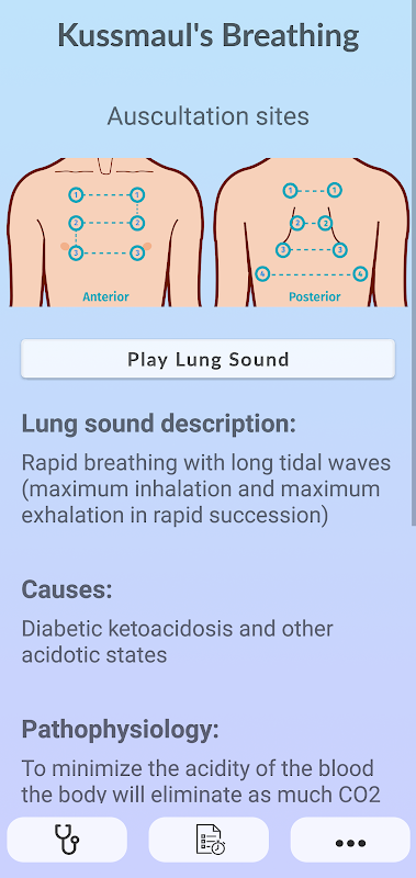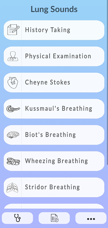 ฟังโรคปอดทั้งหมดและเรียนรู้สาเหตุ แต่ละส่วนประกอบด้วยพยาธิสภาพของปอด (เช่น Cheyne–Stokes) เสียงที่เปล่งออกมา สาเหตุ และการรักษา