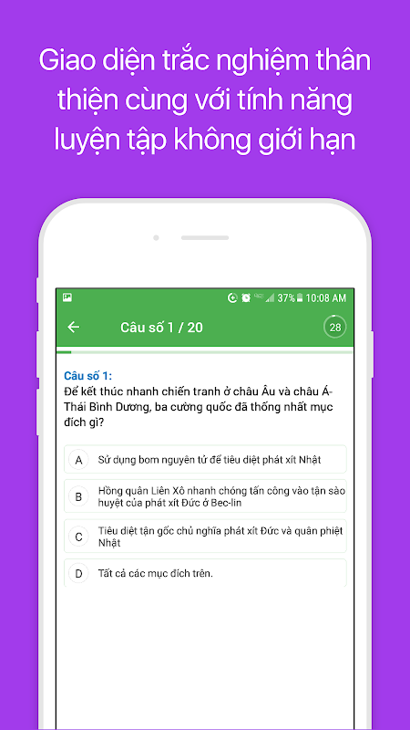 Ứng dụng Luyện thi Lịch sử Trắc nghiệm và Lý thuyết THPT 10, 11, 12 tổng hợp đầy đủ các bộ đề luyện thi mới nhất 2018 hoạt động Offline, và hoàn toàn miễn phí(Free)