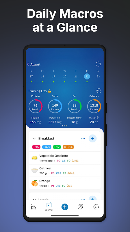 • กำหนดเป้าหมายตัวติดตามมาโครรายวันแบบไม่จำกัดโดยมีเป้าหมายมาโครส่วนตัวสำหรับการปั่นจักรยานแบบคาร์บ การออกกำลังกาย หรือวันพักผ่อน