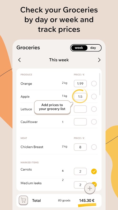 รายการซื้อของชำอัจฉริยะ: สร้างรายการช้อปปิ้งโดยแบ่งตามวันหรือสัปดาห์ เพิ่มราคาสินค้าเพื่อประมาณการต้นทุนและจับตาดูงบประมาณของคุณ.