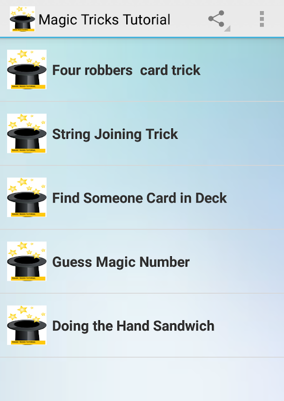 This application provide you many magic trick tutorial that can be easily learn.In this application you can learn how to do card magic trick games , mind reading types magic trick and also string type magic trick.The tutorial is suitable for beginner and also suitable for someone that want to learn magic trick step by step.Enjoy this apps and learn simple magic tricks and also intermediate magic tricks with this apps.