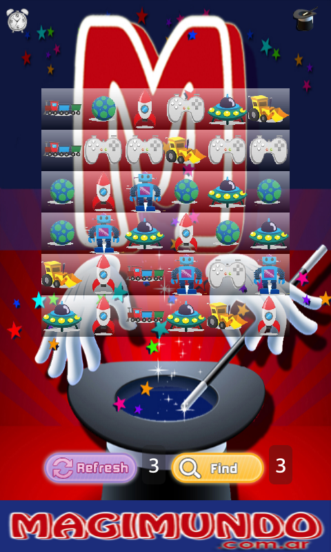 Otra característica emocionante de MAGIMUNDO El Juego que lo hace aún más impresionante que un simple juego es que usted debe encontrar los iconos que enlazan entre sí de alguna manera! Cuando usted hace un partido, MAGIMUNDO El Juego le mostrará el enlace. De esta manera usted también consigue un poco de ayuda en el camino. Puede utilizar el botón ACTUALIZAR 3 veces, esta mezcla los tarjetas de juego por lo que es más fácil de encontrar coincidencias que las unen. También puede utilizar el botón FIND 3 veces, y esto encontrará los enlaces del juego por usted.