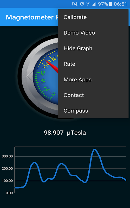 เครื่องวัดที่ช่วยให้คุณสามารถดูค่าแม่เหล็กที่ปรากฏอยู่ในโหมดต้นฉบับเดิม มูลค่าแม่เหล็กจะนำเสนอในμT (microTesla) กราฟแสดงให้เห็นว่าคุณยังกิจกรรมสนามแม่เหล็กที่ผ่านมา