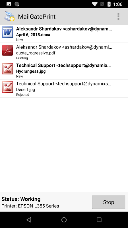 You can interact with MailGatePrint on the device, or via email in case the device does not have screen and keyboard, or is not easily accessible. You can even use Raspberry Pi or other similar IoT device running Android Things. Every time your action is required, you’ll receive an email to respond to.