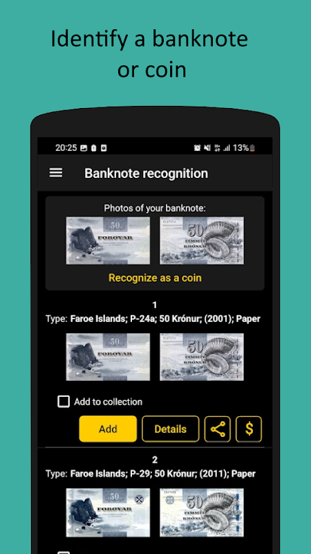 - ระบุเหรียญ ธนบัตร และโทเคนโดยใช้ฐานข้อมูลภาพถ่าย ซึ่งปัจจุบันมีเหรียญมากกว่า 300,000 เหรียญ ธนบัตร 160,000 ฉบับ และโทเคน 15,000 ฉบับ! มีเหรียญที่ระลึกและเหรียญที่ระลึกหลากหลายรุ่นให้เลือกสรร ทั้งเหรียญรูเบิล เหรียญสหภาพโซเวียต เหรียญยูโร และเหรียญดอลลาร์ รวมถึงเหรียญหายาก