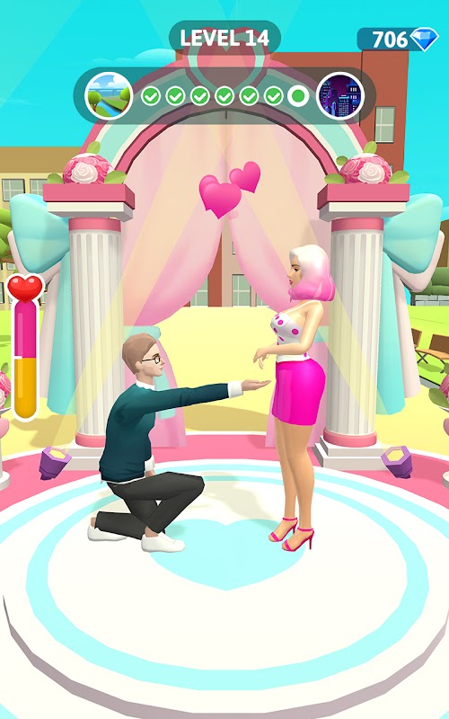 One day, you see the girl in the street, and you decide to say hi. Luckily, she has the feeling for you too. On the runway to the marriage, you may meet many choices, choose your answers and collect as many loving hearts as you can. When you make a proposal at the finale, will she say yes to you?