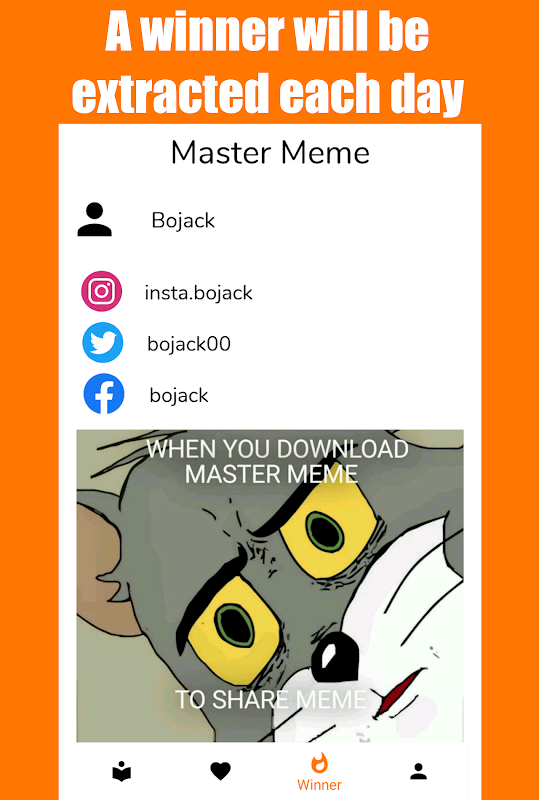 You can like others' memes and receive likes from them. At the end of the day, the user with the highest number of likes will be the winner of that day. His profile will be shown in a dedicated section of the app and it will remain there for the entire day.