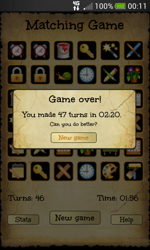 At the beginning all cards are laid in a 6 x 6 grid with face down and player take turns flipping pairs of cards over. If the two cards match, they stay opened. The object of the game is to turn over all pairs of matching cards in the fewest number of turns and shortest time. The fewest number of turns get you higher score!