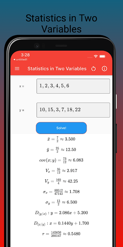 Statistics in One Variable: Discrete and Continuous statistics can be solved by the application. You can find all what you need to solve any statistics in one variable problem.