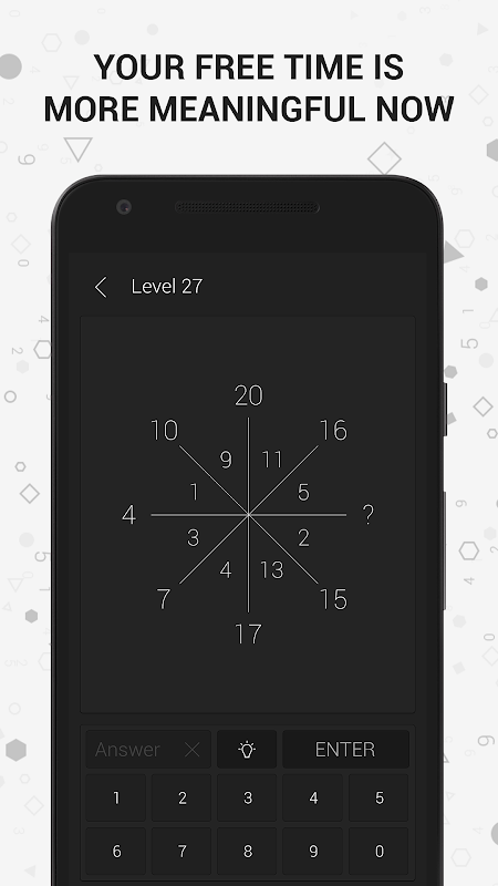 เกมฝึกสมองได้รับการจัดเตรียมไว้โดยใช้แนวทางการทดสอบไอคิว คุณจะต้องแก้ความสัมพันธ์ระหว่างตัวเลขในรูปทรงเรขาคณิต และเติมเต็มตัวเลขที่หายไปในตอนท้าย ปริศนาตรรกะและเกมคณิตศาสตร์มีระดับที่แตกต่างกัน และผู้เล่นที่มีความสามารถในการคิดวิเคราะห์ที่แข็งแกร่งจะจดจำรูปแบบได้ทันทีและแก้ปริศนาได้อย่างง่ายดาย