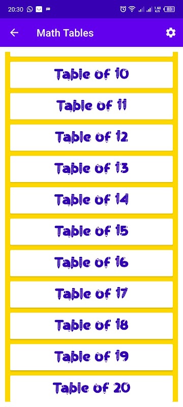 1. ตารางสูตรคูณ 20 ตาราง: แอปประกอบด้วยตารางสูตรคูณ 20 ตาราง ครอบคลุมช่วงทั้งหมดตั้งแต่ 1 ถึง 20 ทำให้ผู้ใช้ได้รับประสบการณ์การเรียนรู้ที่ครอบคลุม