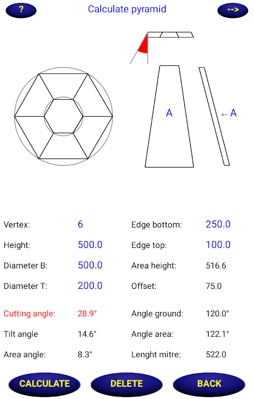 ด้วยสี่มาตรการคุณคำนวณมุมและความยาวทั้งหมดของปิรามิดปิรามิดที่ถูกตัดทอนหรือ Schifterschnitts (สองในพื้นผิวเอียงมุมใด ๆ )