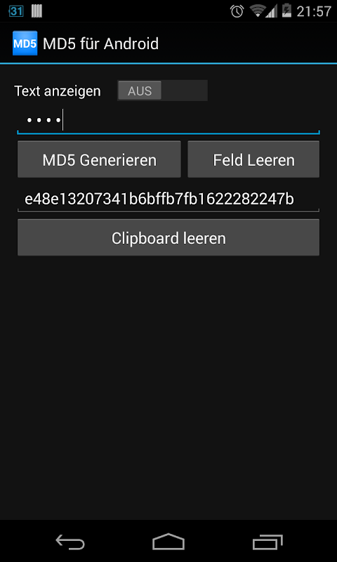 MD5 for Android is a simple und minimalistic app which generates MD5 hashes from text input.