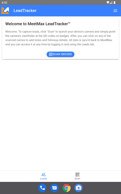 ยินดีต้อนรับสู่แอป MeetMax LeadTracker ซึ่งเป็นผลิตภัณฑ์ของ TWST Events แอพนี้จะอนุญาตให้คุณใช้กล้องในโทรศัพท์ของคุณเพื่อสแกนรหัส QR ที่สร้างขึ้นบนป้ายที่พิมพ์โดยบริการ MeetMax Bagging