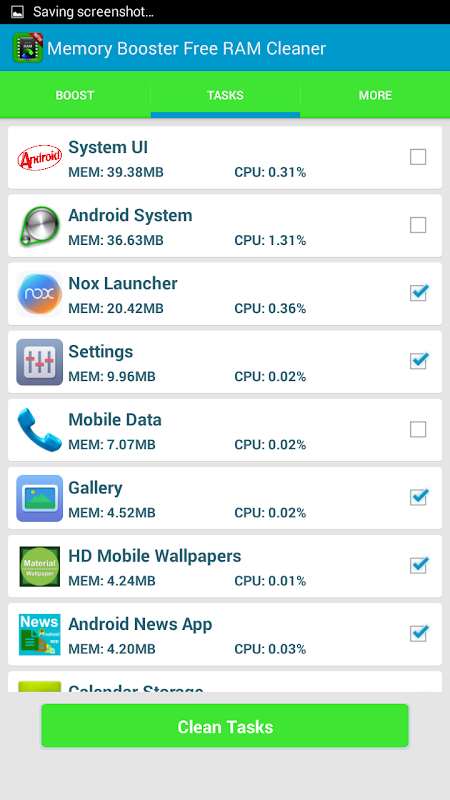 Memory Booster Free RAM Cleaner you can boost your RAM with single touch. Touch boost button and clear running process. In Tasks tab you can swipe to clean individual process from ram memory. In more tab you also know about your internal and external memory status.