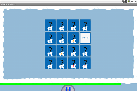 This varaint extends the game to the feature of solving arithmetic problems while you are seraching for pairs. Furthermore you play against the clock. The arithmetic problems and the defined play time is construed for kids in school class 4 or higher.