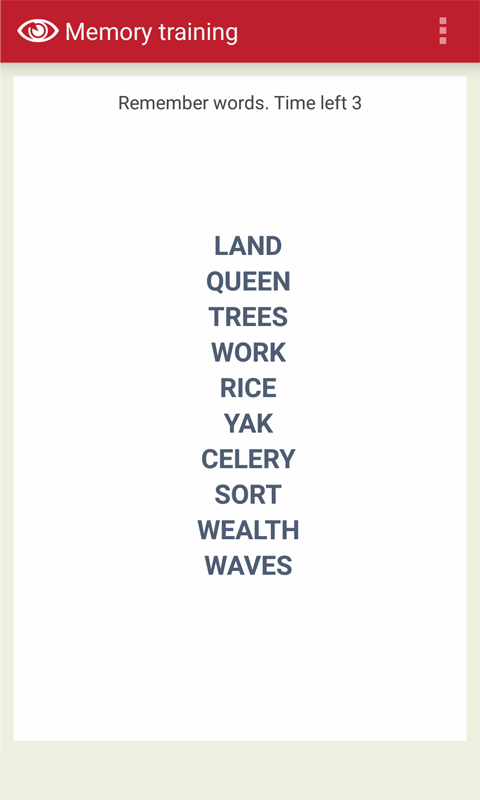 Our application is designed for forgetful people who are going to develop their mind, to improve their visual memory and recollection and exercise their brain. During the specified period you need to remember a certain number of words. After the end of time you must reproduce all these words in the same order. Voice input for one word or all words at once is supported. This memory game will train your brain to remember more information, will boost your memory and will make your memory sharper.