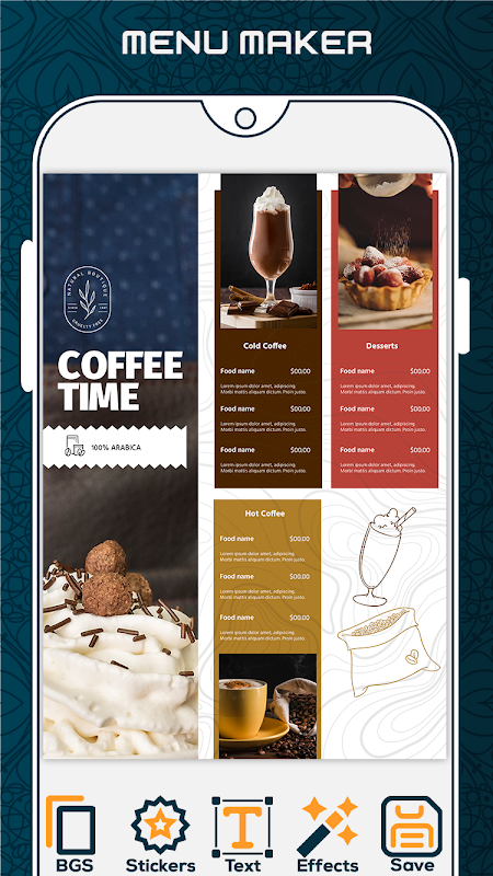 สร้างเมนูสำหรับร้านกาแฟหรือร้านอาหารของคุณด้วยเครื่องทำเมนู ปรับแต่งเทมเพลตเมนู ใช้งานง่ายและรวดเร็ว ไม่จำเป็นต้องมีทักษะการออกแบบการ์ดเมนู