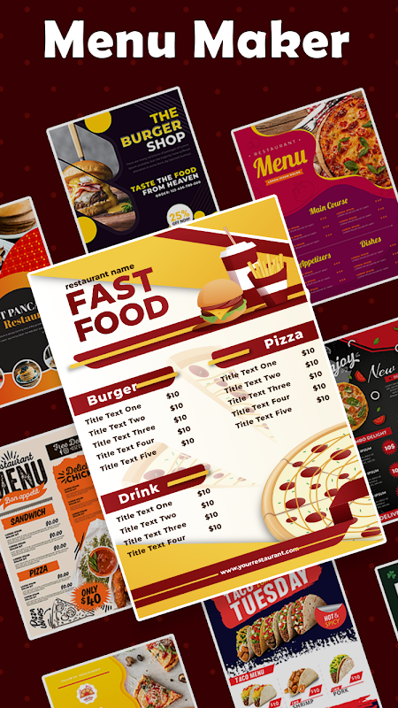 เครื่องมือสร้างเมนูมีเทมเพลตสำหรับเมนูและใบปลิว และนี่คือรายการเทมเพลตเมนูที่ปรับแต่งได้ซึ่งจัดทำโดยผู้สร้างเมนู
