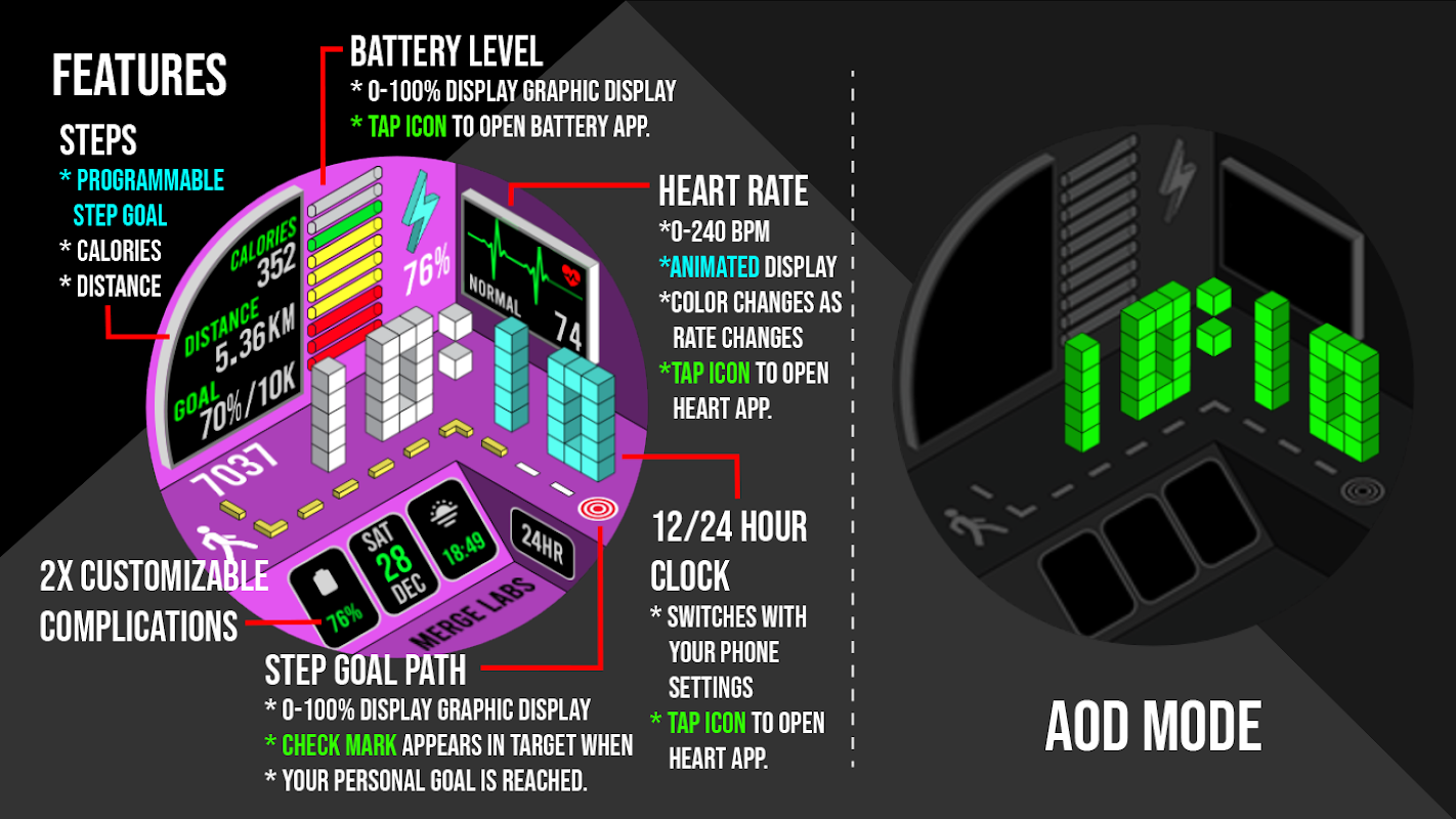 นาฬิกาไอโซเมตริกเรือนนี้รวมการออกแบบไอโซเมตริกไว้ในรายการทั่วไป เช่น อัตราการเต้นของหัวใจ จำนวนก้าว และพลังงานแบตเตอรี่ที่คุณเห็นบนหน้าปัดอื่นๆ แต่มีสไตล์ที่แตกต่างอย่างสิ้นเชิง