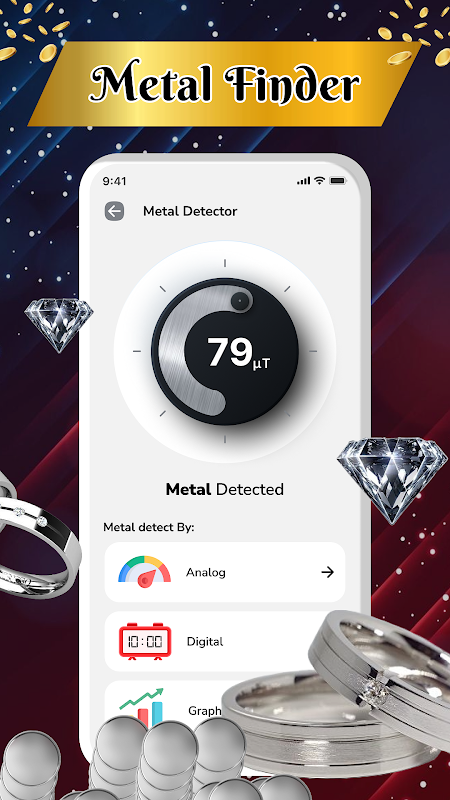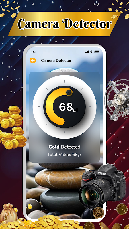 แอพ Gold Detector สแกนสภาพแวดล้อมของคุณและตรวจจับวัตถุที่เป็นโลหะด้วยสายตา กล้องตรวจจับทองช่วยให้สามารถตรวจจับรายการทองคำได้อย่างแม่นยำ ด้วยเครื่องตรวจจับทองพร้อมเสียง คุณจะได้รับการแจ้งเตือนทุกครั้งที่ตรวจพบโลหะ ทำให้กระบวนการค้นหามีประสิทธิภาพมากยิ่งขึ้น สำหรับผู้ที่ต้องการสแกนภาพ Gold Detector Camera Scanner เป็นคุณสมบัติที่เหมาะสมสำหรับพวกเขา มันใช้กล้องของอุปกรณ์ในการสแกนและตรวจจับทองคำและโลหะอื่น ๆ ทำให้คุณมีเครื่องมือที่ครอบคลุมสำหรับการตรวจจับโลหะ ไม่ว่าคุณกำลังมองหาสมบัติที่ซ่อนอยู่ในสวนหลังบ้านหรือค้นหาสิ่งของที่สูญหายในบ้าน แอปเครื่องตรวจจับโลหะพร้อมกล้องจะทำให้การตรวจจับโลหะเป็นเรื่องง่ายและสนุกสนาน การออกแบบที่เรียบง่ายและคุณสมบัติที่ใช้งานง่ายทำให้ผู้ใช้ทุกคนสามารถเข้าถึงได้