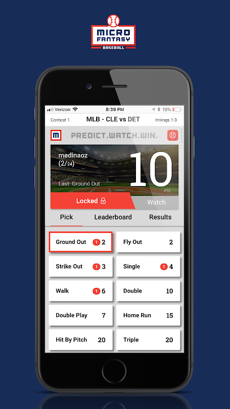 One touch to predict live outcomes per play or at bat while watching any baseball, football, or basketball