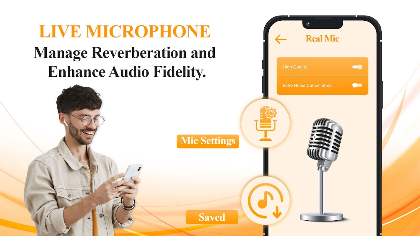 ไมโครโฟนสดพร้อมเอฟเฟกต์เสียงสะท้อนช่วยให้คุณใช้ไมโครโฟนเป็นมือถืออัจฉริยะของคุณ มันจะให้เอฟเฟกต์เสียงสะท้อน และคุณสามารถเชื่อมต่อมือถือของคุณกับลำโพง Bluetooth จากนั้นอุปกรณ์อัจฉริยะของคุณจะทำงานเหมือน Real Mic พร้อมเอฟเฟกต์เสียงสะท้อน ดังนั้นนี่จะเป็นเรื่องง่ายมากและคุณสามารถใช้แอพนี้ได้อย่างง่ายดายและแอพนี้มีส่วนต่อประสานกับผู้ใช้ที่เป็นมิตร แอปนี้จะแก้ปัญหาที่แท้จริงของคุณตอนนี้คุณไม่จำเป็นต้องพกไมโครโฟนจริงติดตัวไปด้วย เพียงเชื่อมต่อสมาร์ทโมบายของคุณด้วยบลูทูธ แล้วพูดสิ่งที่คุณต้องการพูด จากนั้นมันจะทำงานเหมือนไมค์ดั้งเดิม นั่นคือสาเหตุที่เราเรียกว่าไมโครโฟนสดพร้อมเอฟเฟกต์เสียงสะท้อน