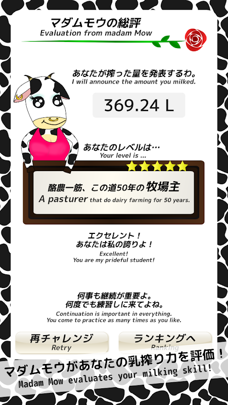 ในแอพนี้ปริมาณการรีดนมของคุณจะได้รับการประเมินโดยตัวละครพิเศษ "Madame Mou" ดังนั้นเรามาพยายามอย่างเต็มที่เพื่อให้ได้การประเมินที่ดี!