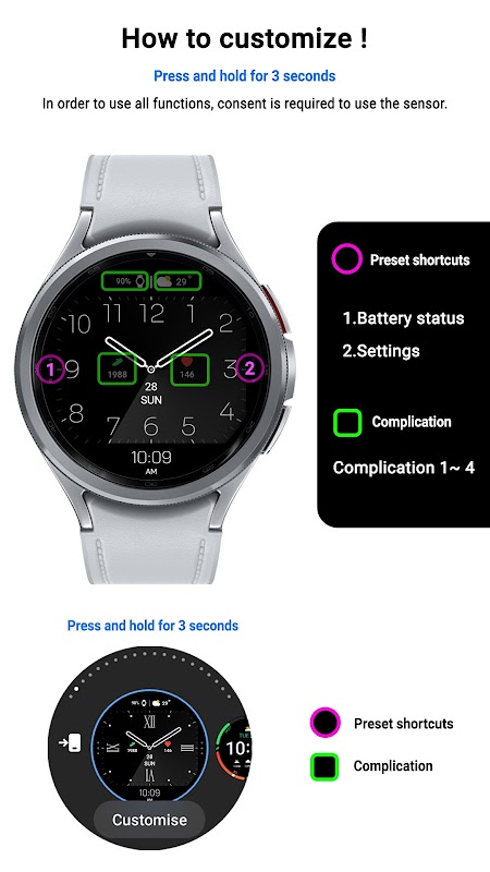 กดหน้าปัดนาฬิกาค้างไว้ > 2. คลิกปุ่มตกแต่ง > 3. แตะแต่ละส่วนที่ซับซ้อนเพื่อตั้งค่าข้อมูลที่เกี่ยวข้อง > 4. คลิกตกลง