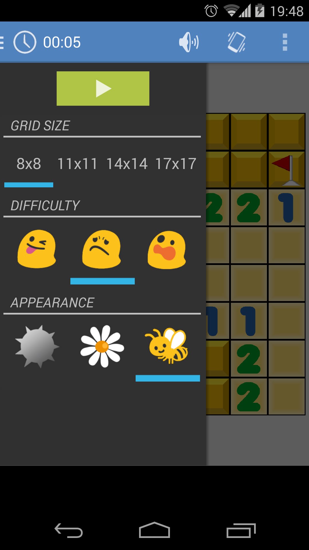 - You can select between different grid sizes, appearance and difficulty. To show the options, you have to swipe from the left edge of the screen or click on the time.