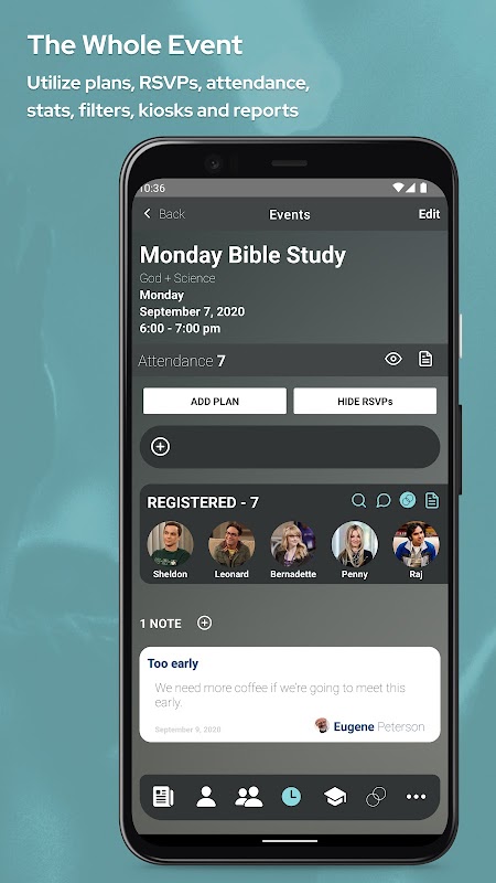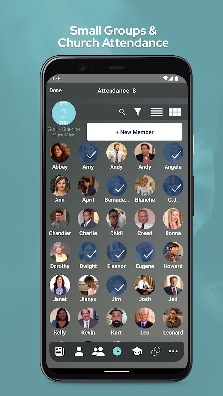 รวบรวมข้อมูลที่จำเป็นเกี่ยวกับสมาชิกของคุณรวมถึงข้อมูลติดต่อและภาพถ่าย ตั้งกลุ่มเล็ก ๆ ที่ผู้นำกลุ่มเล็กของคุณสามารถเข้าร่วมในกิจกรรมของพวกเขาบันทึกช่วงเวลาของกระทรวงเมื่อการสนทนาหรือการตัดสินใจที่มีความหมายเกิดขึ้นและเข้าถึงข้อมูลการติดต่อเพื่อดูแลผู้ที่อยู่ในกลุ่มของพวกเขา